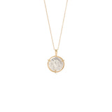 A white gold coin circled by gold and strung on a gold chain, of «Reversal Appolo» it’s a piece from the ancient city of Istrus located in the Danube Delta on the western edge of the Black Sea, the image featured Appolo the sun god and its inversion would be inspired by the solar eclipse visible at Istrus in 434 BC. Be your own goodness of Sun!