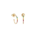 Shiny delicate hoop earrings in gold set with gemstones of seven different colors including white diamonds as a flash of rainbow! Allow the high vibration of the stones to make you shine and feel fully divine!